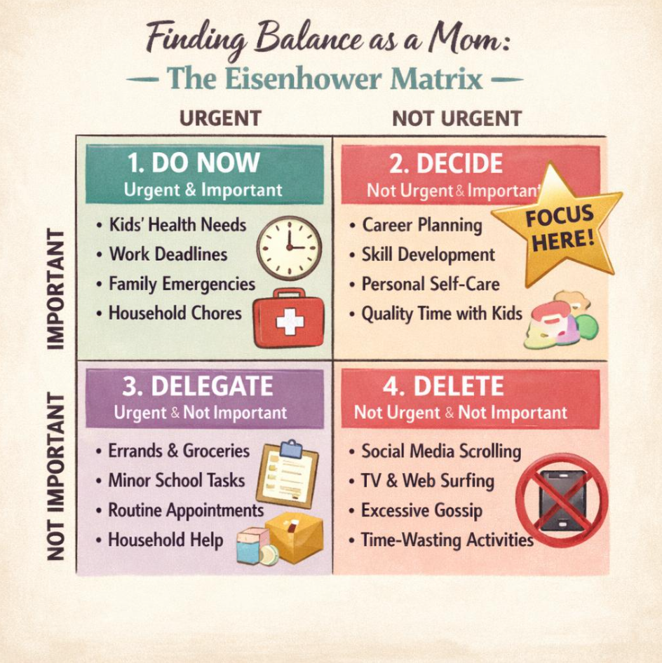 The toddler’s lost shoe, the looming school deadline, and the endless cycle of household management are all urgent; they are absolutely important and demand your immediate attention to get out the door! However, when your entire day is consumed by reacting to urgency, the things that are "Important but Not Urgent," such as your personal growth, often get pushed to the side.
